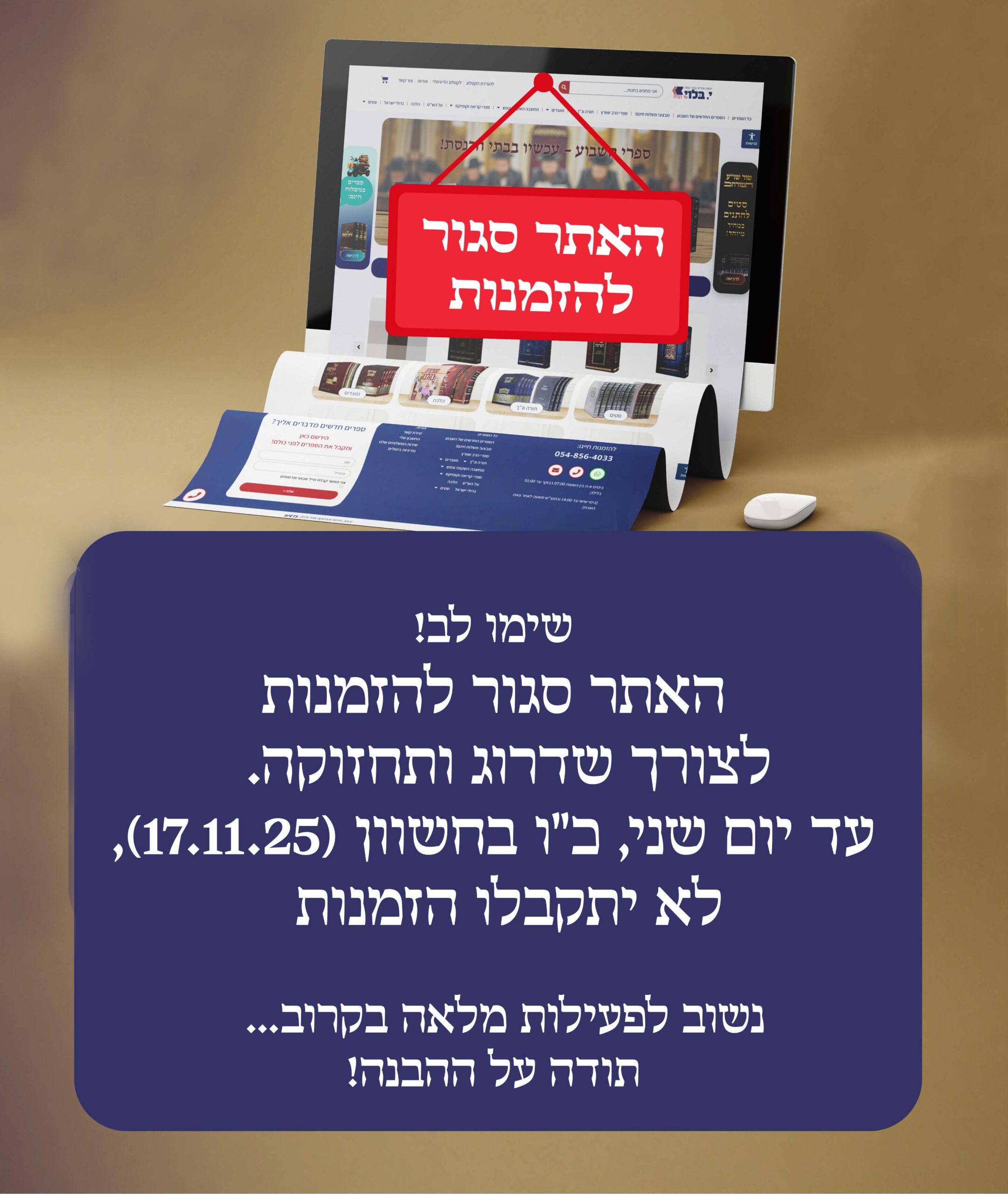 שימו לב! האתר סגור להזמנות לצורך שדרוג ותחזוקה עד יום שני, כ"ו בחשוון (17.11.25)