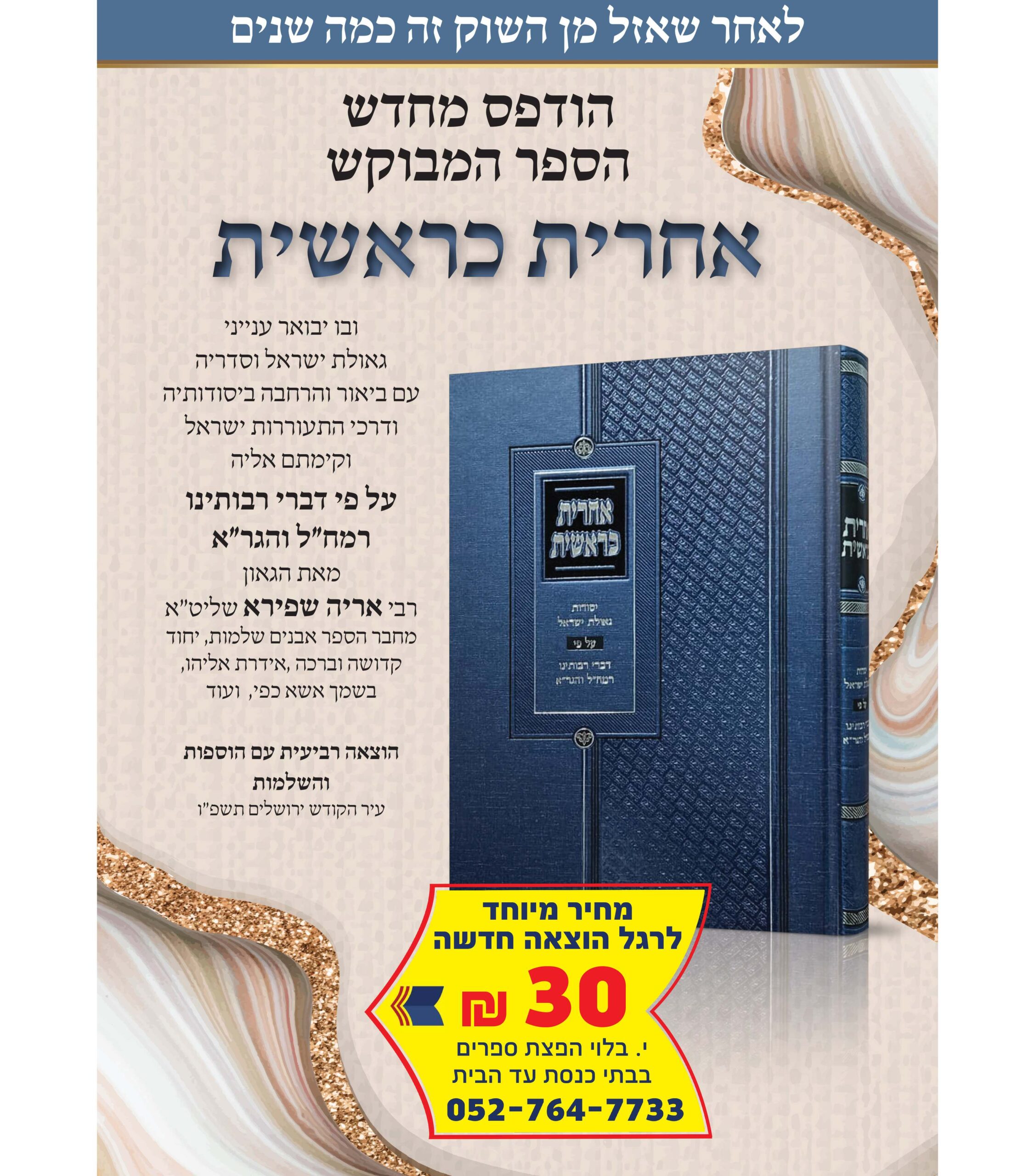ובו יבואר ענייני גאולת ישראל וסדריה עם ביאור והרחבה ביסודתיה ודרכי ההתעוררות ישראל וקימתם אליה על פי דברי רבותינו רמח"ל והגר"א מאת הגאון רבי אריה שפירא שליט"א מחבר הספרים אבנים שלמות, יחוד קדושה וברכה, אידרת אליהו, ועוד הוצאה רביעית עם הוספות והשלמות
