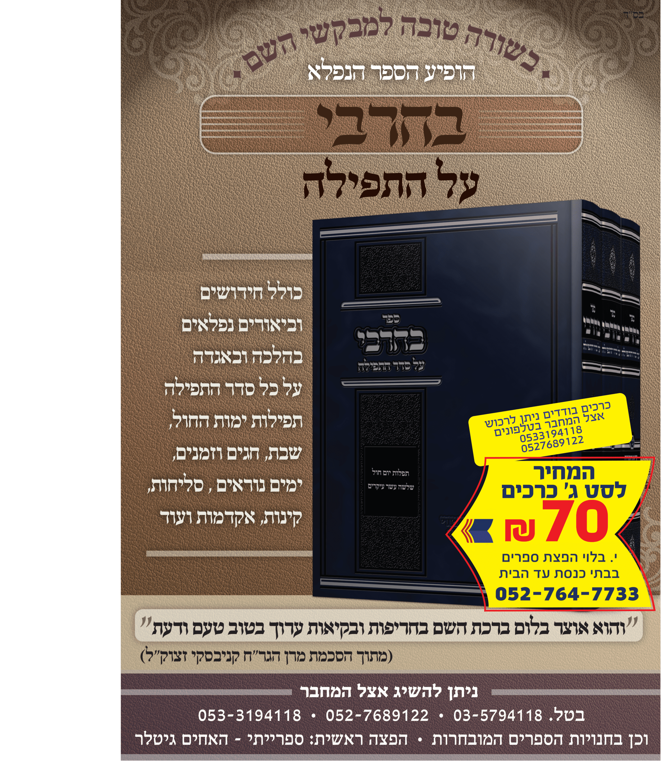 בחרבי על סדר התפילה כולל חידושים וביאורים נפלאים בהלכה ובאגדה על כל סדר התפילה תפילות ימות החול, שבת, חגים וזמנים, ימים נוראים, סליחות, קינות, אקדמות ועוד
