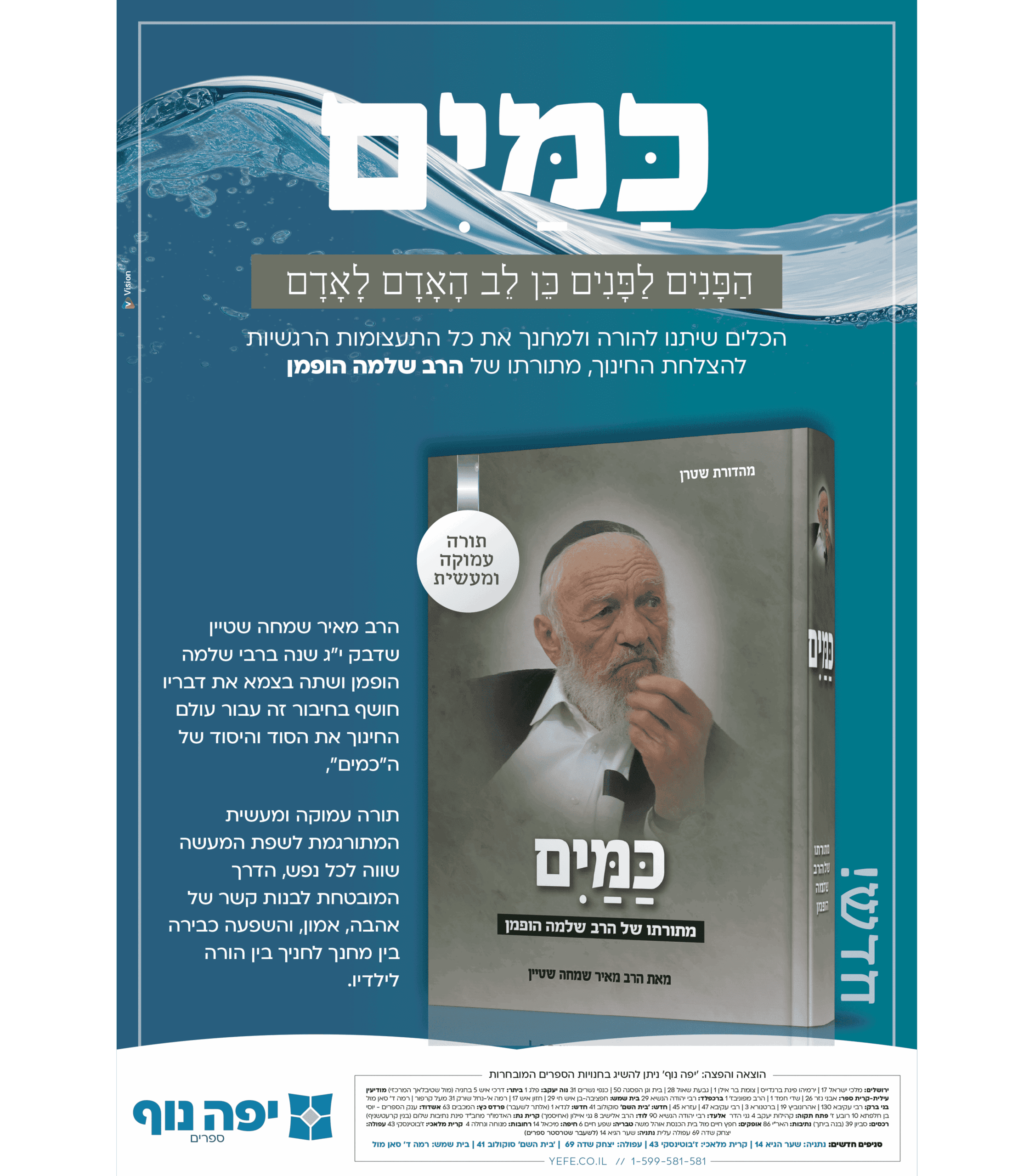 הרב מאיר שמחה שטיין שדבק י"ג שנה ברבי שלמה הופמן ושתה בצמא את דבריו חושף בחיבור זה עבור עולם החינוך את הסוד והיסוד של ה"כמים", תורה עמוקה ומעשית המתורגמת לשפת המעשה שווה לכל נפש, הדרך המובטחת לבנות קשר של אהבה, אמון, והשפעה כבירה בין מחנך לחניך בין הורה לילדיו.