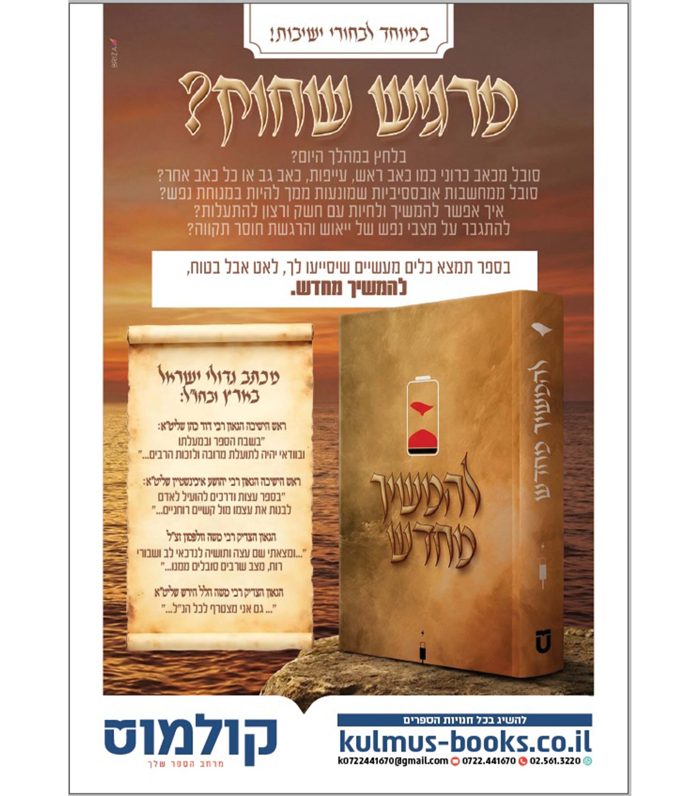 מרגיש שחוק? בספר תמצא כלים מעשיים שיסייעו לך, לאט אבל בטוח, להמשיך מחדש…הספר מעוטר בהסכמות גדולי ראשי הישבות בדורינו ובראשם הגאון רבי דוד כהן שליט"א ראש ישיבת חברון