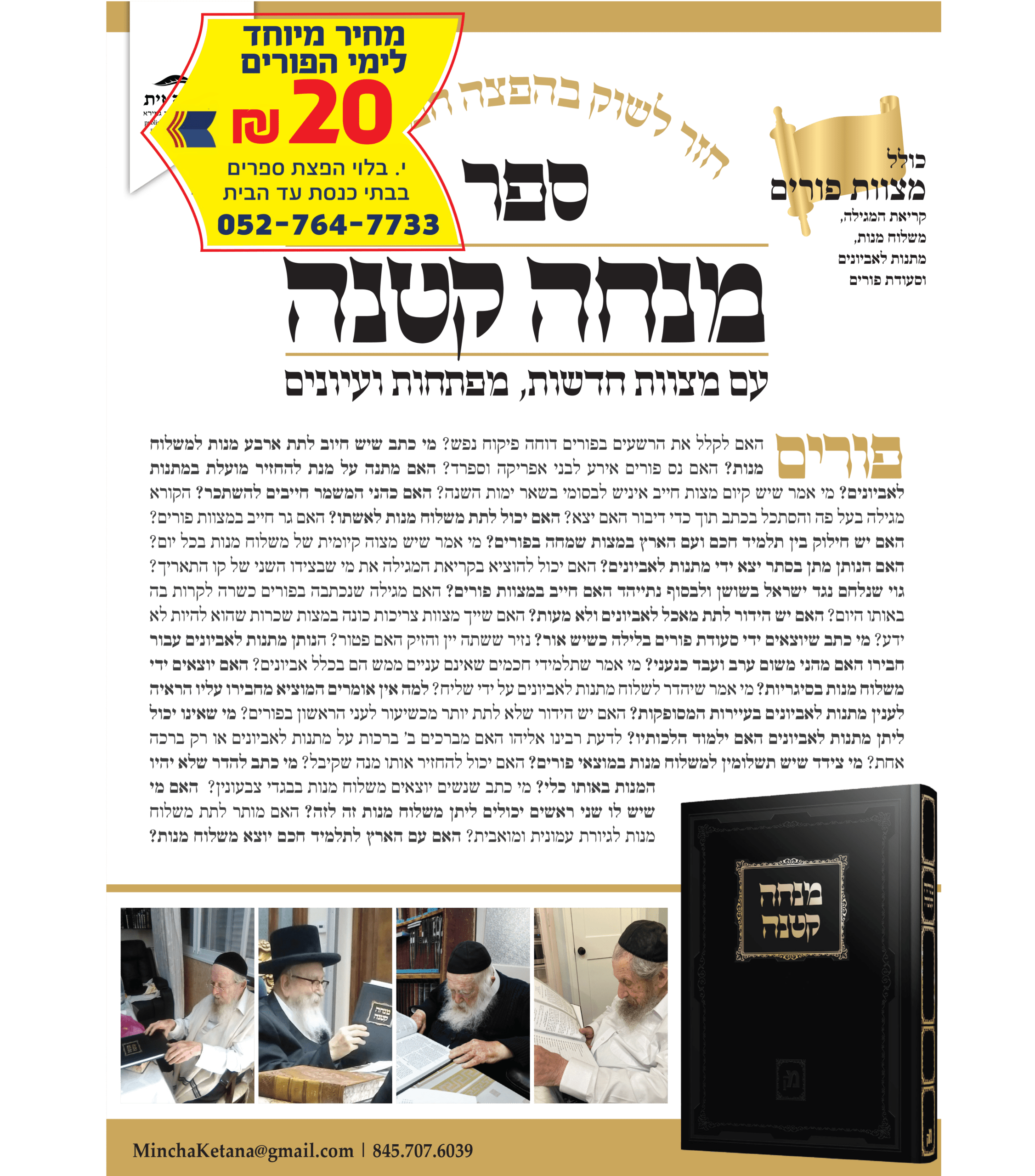 ספר מנחה קטנה – כולל מצוות פורים קריאת המגילה, משלוח מנות, מתנות לאביונים, וסעודת פורים,עם מצוות חדשות מפתחות ועיונים